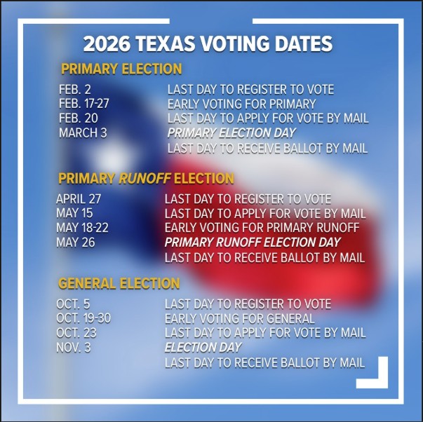 *New voter registrations, change address or update a voter registration due by Monday February 2, 2026.